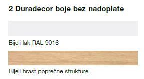 • Površina Duradecor otporna na velika opterečenja u bijeloj boji RAL 9016 i struktura bijelog hrasta poprečna